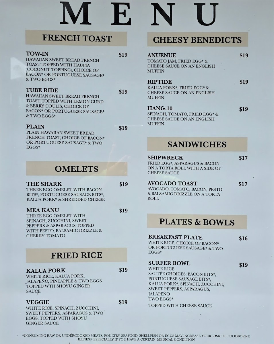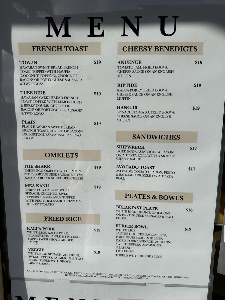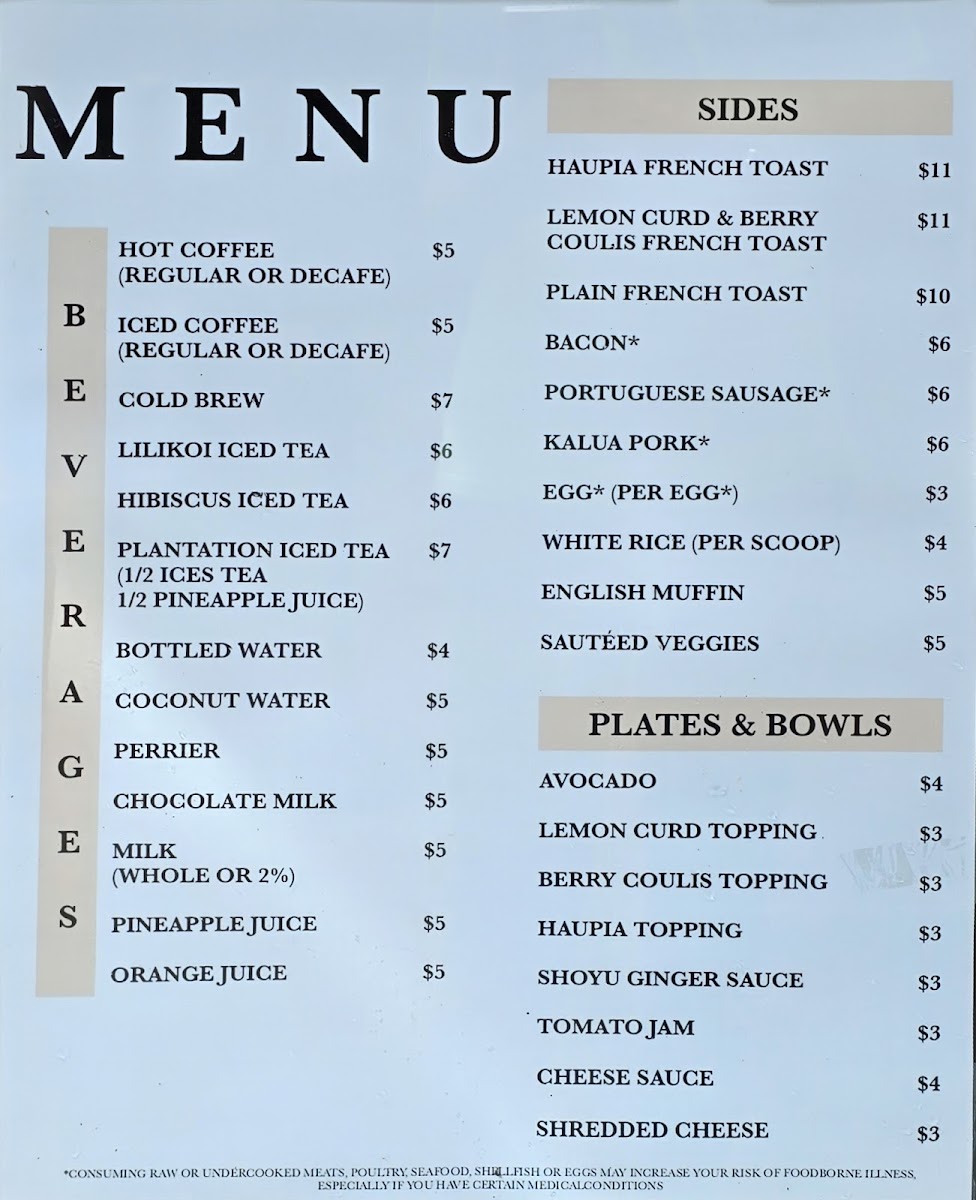 French toast topped with haupia (coconut pudding) and roasted macadamia nuts, two eggs*, bacon or portuguese sausage, served with 100% maple syrup